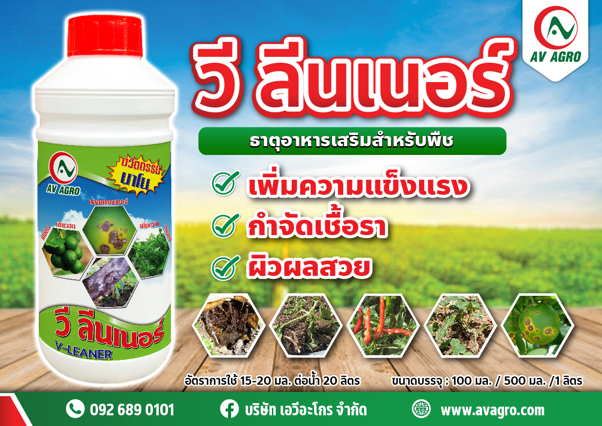 วี ลีนเนอร์ คุณสมบัติ : เป็นปุ๋ยเคมีชนิดน้ำ ประกอบด้วย ประโยชน์ เกี่ยวข้องในการสร้างสารควบคุมการเจริญเติบโต (Auxin) ที่ปลายยอด ช่วยให้พืชแตกตาดอก