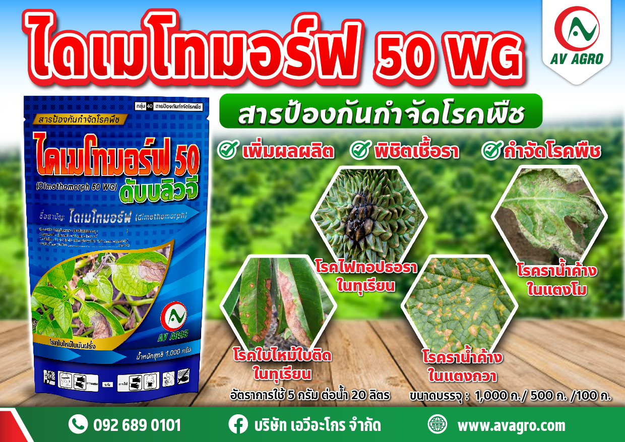 ไดเมโทรมอร์ฟ 50 ดับบลิวจี สารป้องกันกำจัดโรคพืช ประโยชน์ : ใช้ในการป้องกันกำจัดโรคใบไหม้ (late blight) ในมันฝรั่งที่มีสาเหตุจากเชื้อรา Phytopthora infestans