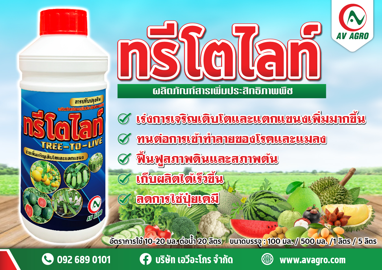 ทรีโตไลท์ หัวเชื้ออาหารเสริมชนิดเข้มข้น เหมาะสำหรับพืชผักและนาข้าว เสริมสร้างการแบ่งเซลล์พืช ส่งเสริมการแตกแขนง และตาดอก ตามใบของพืชในระยะต้นเล็ก คุณสมบัติพิเศษ สามารถแช่เมล็ดก่อนการปลูกหรือเพาะ เพื่อเริ่งการงอก และ ทำให้ต้นแข็งแรง สามารถใช้แทนปุ๋ยยูเรียได้ โดยไม่ทำให้พืชแสดง อาการเฝือใบไม่ติดผล เร่งการออกรวงของข้าว เพิ่มน้ำหนัก เร่งการสุกของข้าวและลดการใช้ปุ๋ยเคมี และเพิ่ม ผลผลิตได้อย่างดี ประโยชน์