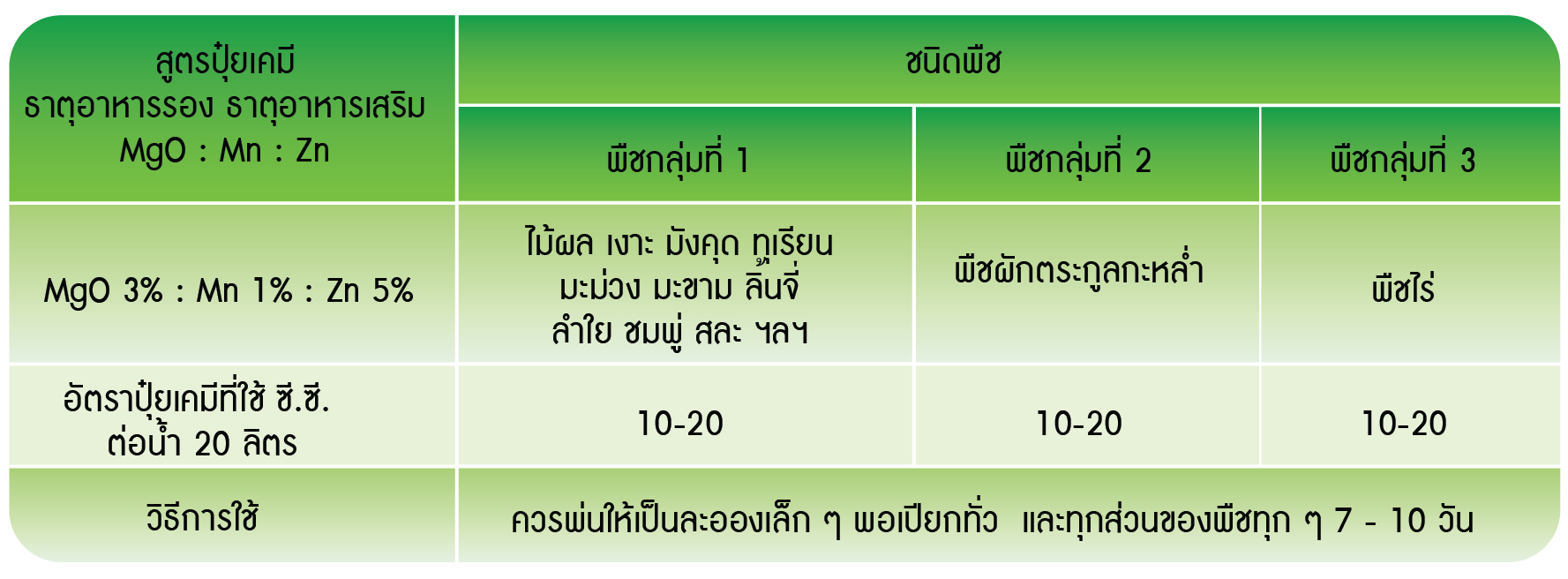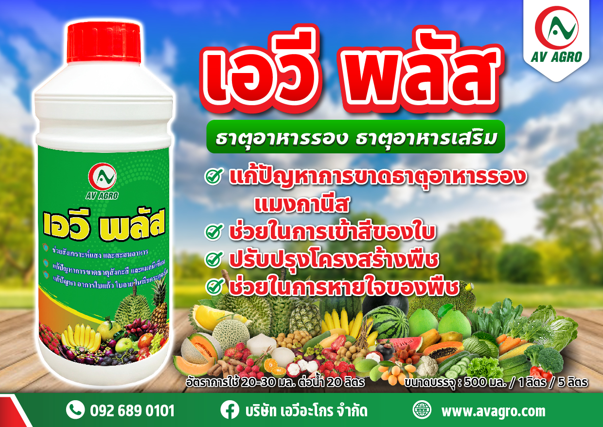 เอวี-พลัส ปุ๋ยเคมีชนิดน้ำ ธาตุอาหารรอง ธาตุอาหารเสริม ปริมาณธาตุอาหารรอง : แมกนีเซียม (MgO) ............................................ 3% ประโยชน์ องค์ประกอบของออกซิน (auxin) ช่วยในการสร้างตายอด และตาดอกของพืช เป็นส่วนประกอบของคลอโรฟิลล์ เพิ่มการสังเคราะห์แสง ช่วยในการสังเคราะห์โปรตีน ทำให้พืชสร้างแป้ง และน้ำตาลมากขึ้น เพิ่มการสร้างคลอโรฟิลล์ ทำให้ใบเขียวเข้ม ใบหนา ช่วยให้พืชทนหนาวได้ดี แก้อาการใบแก้ว ใบลายในส้ม มะนาว และแก้อาหารขาดธาตุสังกะสี