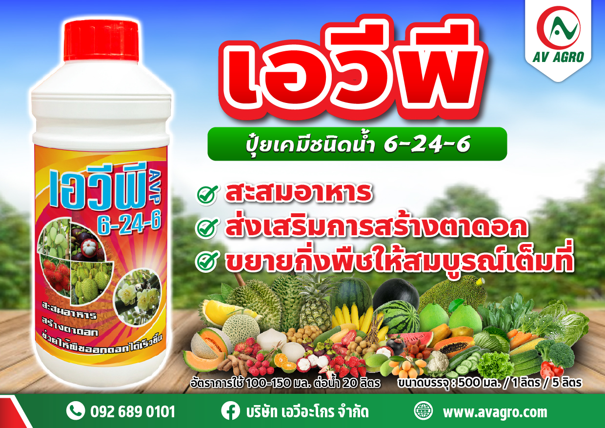 เอวี พี ปุ๋ยเคมีชนิดน้ำ ประกอบด้วยปริมาณธาตุอาหารรับรอง ดังนี้ ไนโตรเจนทั้งหมด (N) ................................................................................... 6% ประโยชน์ พืชสามารถดูดซึมธาตุอาหารไปใช้ได้โดยทางรากและทางใบ ใช้ในช่วงออกดอก ช่วยเสริม