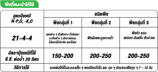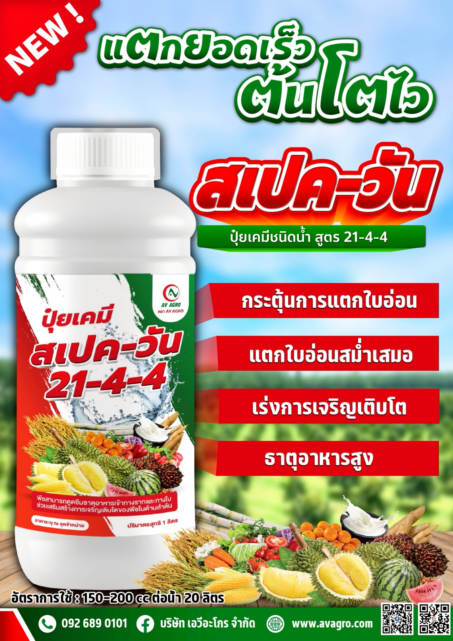 สเปค- วัน คุณสมบัติ เป็นปุ๋ยเคมีชนิดน้ำ ประกอบด้วยปริมาณธาตุอาหารรับรอง ดังนี้ ไนโตรเจนทั้งหมด (N).....21% ฟอสฟอรัสที่เป็นประโยชน์ (P2O5)..4% โพแทสเซียมที่ละลายน้ำ (K2O).. 4% ประโยชน์ พืชสามารถดูดซึมธาตุอาหารเข้าทางรากและทางใบ ช่วยเสริมสร้างการเจริญ เติบโตของพืชในด้านลำต้นและใบในระยะแรกของการเจริญเติบโต