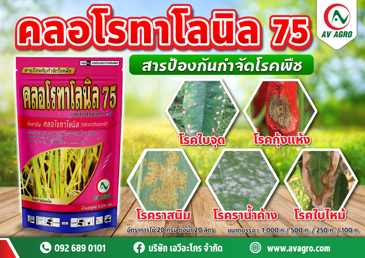 คลอโรทาโลนิล 75 สารป้องกันกำจัดโรคพืช ประโยชน์ : ใช้ป้องกันกำจัดโรคกาบใบแห้ง (sheath blight) ในข้าวที่มีสาเหตุจากเชื่อรา Rhizoctonia solani (Thanatephorus cucumeris)