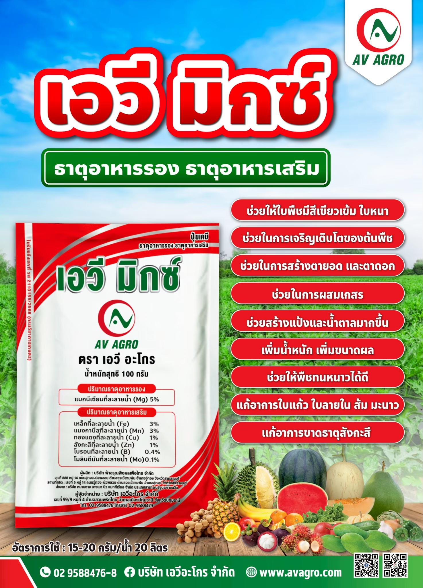 เอวี มิกซ์ คุณสมบัติ เป็นปุ๋ยเคมีชนิดผง ประกอบไปด้วยปริมาณธาตุอาหารรอง ดังนี้ แมกนีเซียมที่ละลายน้ำ (Mg)...................................... 5% ปริมาณธาตุอาหารเสริมดังนี้ ประโยชน์ เป็นส่วนประกอบของคลอโรฟิล์ที่พืชใช้ในการสังเคราะห์แสง ช่วยให้ใบพืชมีสีเขียวเข้ม ใบหนา ช่วยในการเจริญเติบโตของต้นพืช เป็นองค์ประกอบของออกซิเจน ช่วยในการสร้างตายอด และตาดอก เป็นส่วนประกอบของคลอโรฟิลล์ เพิ่มการสังเคราะห์แสง เป็นตัวสำคัญในกระบวนการหายใจของพืช ทำให้พืชใช้ธาตุเหล็ก ธาตุโพเทสเซียม และธาตุแคลเซียมไปใช้ได้ดีขึ้น ช่วยในการทำงานของเอนไซนม์ ช่วยในการสังเคราะห์โปรตีนทำให้พืชสร้างแป้งและน้ำตาลมากขึ้น ช่วยในการผสมเกสร ป้องกันเมล็ดลีบ เพิ่มน้ำหนัก ช่วยให้พืชทนหนาวได้ดี แก้อาการใบแก้ว ใบลายใน ส้ม มะนาว และแก้อาการขาดธาตุสังกะสี
